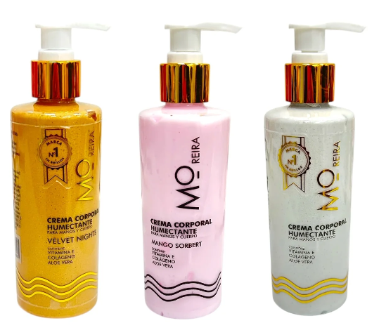 Beneficios de los productos Moreira • Hidratación profunda • Con aloe vera, vitamina E y colágeno • Aroma duradero • Aptos para manos y cuerpo • Opciones con y sin brillo
