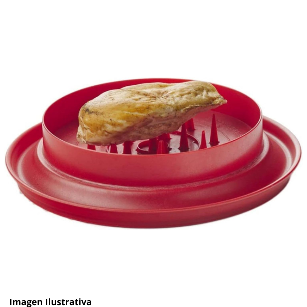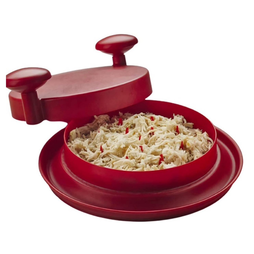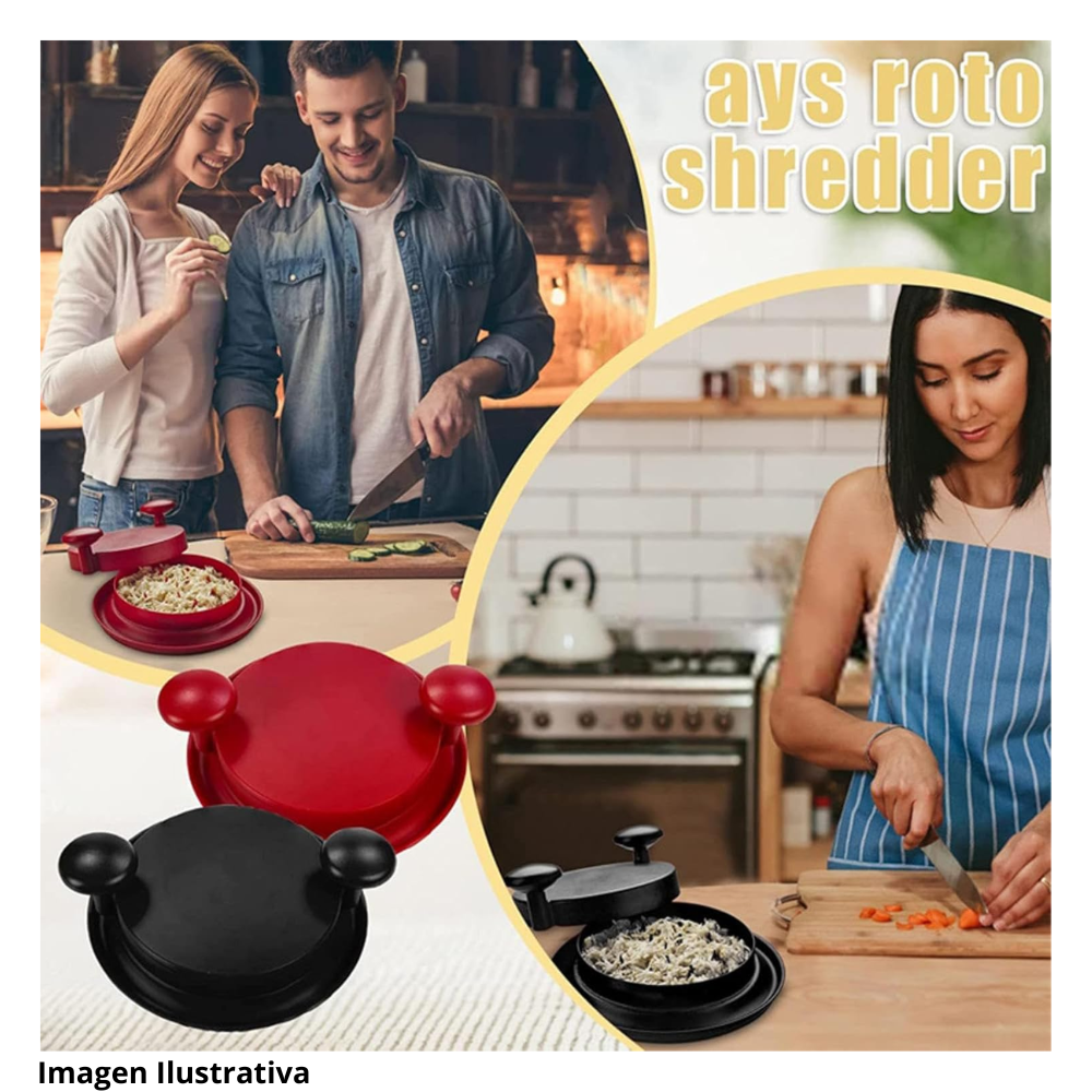 Utensilio manual orientado a desmenuzar alimentos cocidos mediante movimiento rotatorio. El producto muestra estructura circular estable, base amplia, recipiente profundo, tapa superior ajustable y dos agarraderas superiores que facilitan el giro alternado. En el interior se observan relieves o puntas fijas que intervienen durante el proceso mecánico manual.