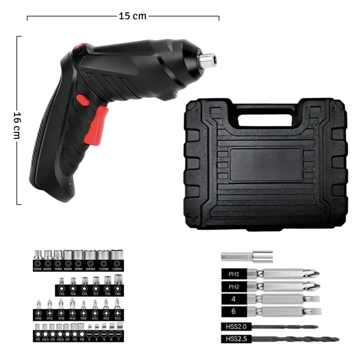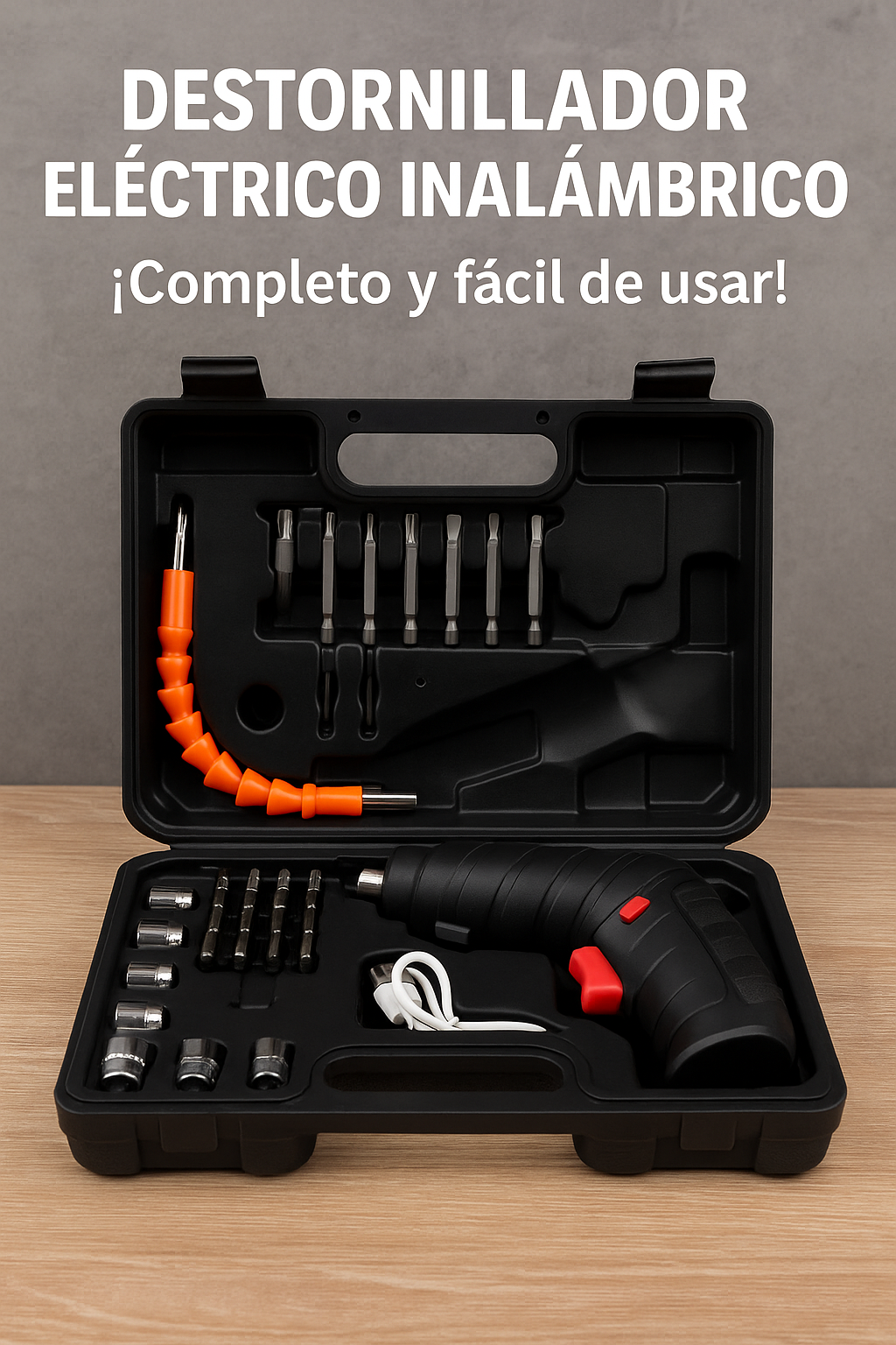 🔋 Inalámbrico y recargable⚡ Ahorra tiempo y esfuerzo🧰 Kit completo de puntas🔄 Extensión flexible incluida👌 Diseño ergonómico y ligero🏠 Ideal para el hogar y reparaciones📦 Incluye estuche resistente🔧 Fácil de usar, sin experiencia