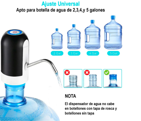 Fácil de Usar: Simplemente se coloca sobre la boca del botellón (compatible con capacidades desde 4.5 L hasta 20 L) y se presiona un botón para activar el bombeo de agua.