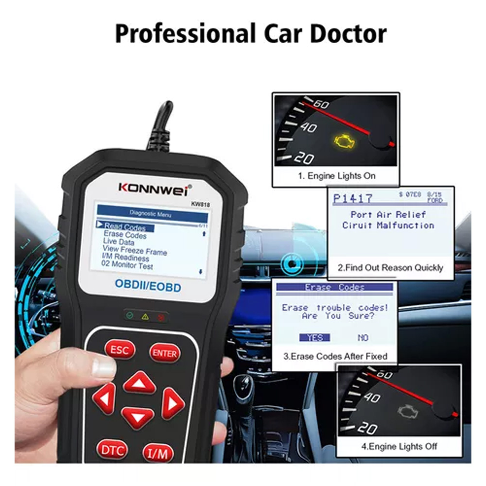 Potencia tu conocimiento automotriz con el escáner profesional KW818, una herramienta indispensable para cualquier amante de los autos o mecánico que busque precisión, practicidad y rendimiento profesional. Este dispositivo ha sido diseñado para ofrecer diagnósticos rápidos, claros y detallados, permitiéndote detectar fallas y mantener tu vehículo en óptimas condiciones sin necesidad de visitas frecuentes al taller.