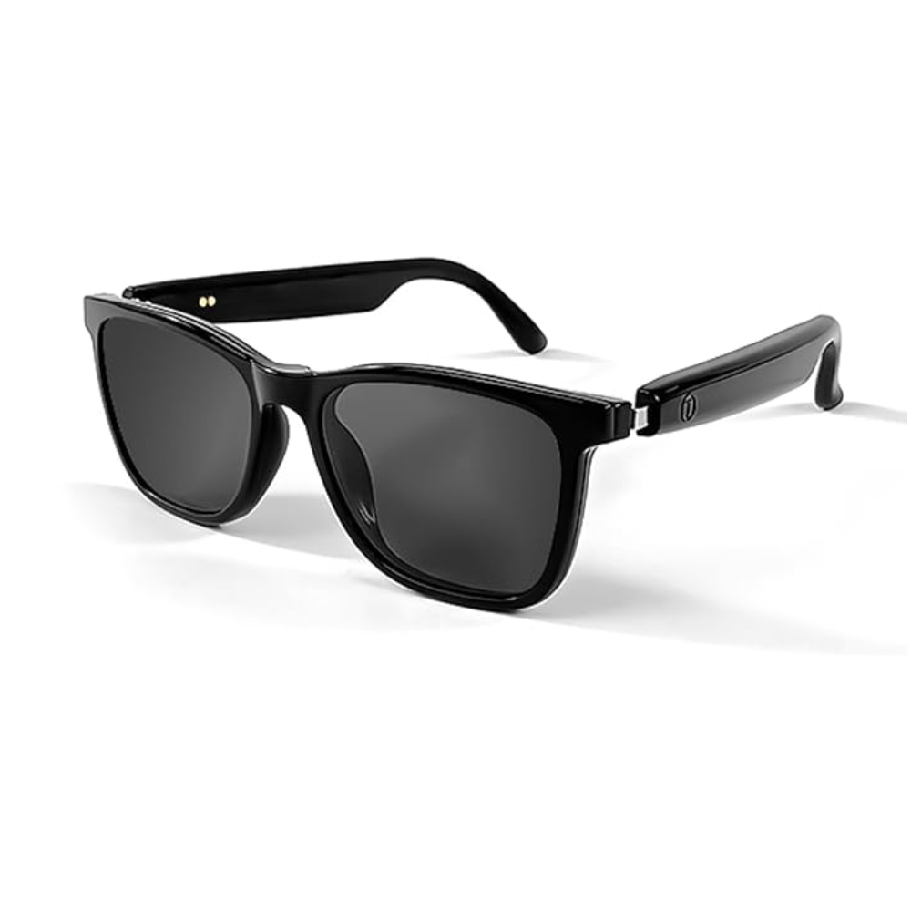 Accesorio wearable diseñado integracion tecnologia portatil dentro de estructura tipo gafas. Presenta montura completa formato rectangular, lentes oscuros continuos y patillas gruesas que sugieren alojamiento componentes internos. El diseño mantiene la apariencia convencional mientras incorpora función tecnológica integrada.