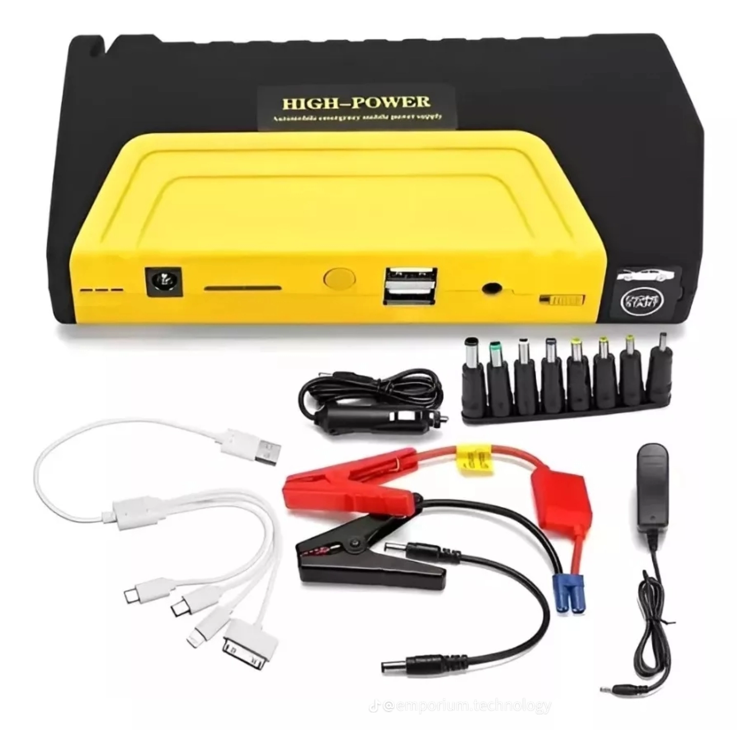 Encantessa emite factura electrónica fácil y rápido. Arrancador portátil de batería para carro y moto con compresor, power bank 16800mAh, multifuncional 12V, kit de emergencia con linterna, cargador USB, adaptadores múltiples, ideal para viaje, camping, carretera y uso doméstico Este versátil arrancador portátil de batería para carro y moto incluye una potente batería externa de 16.800mAh, compresor para inflar llantas, linterna LED de emergencia, múltiples salidas USB y adaptadores para diversos dispositivos. Es un kit multifuncional ideal para viajes por carretera, campamentos o emergencias en el hogar. Gracias a su corriente pico de 600A, puede arrancar motores de gasolina hasta 5.0L y diésel hasta 3.0L con facilidad. Especificaciones técnicas: Capacidad: 16.800mAh Compatible con: Motores diésel hasta 3.0L y gasolina hasta 5.0L Material: Carcasa resistente en plástico Peso: 375 g Dimensiones del arrancador: 17 x 8.5 x 3 cm Salidas USB: 5V / 1A – 2.1A Salidas de voltaje ajustables: 12V / 16V / 19V — 2A / 3A / 3.5A Entrada de carga: 12V - 1A Corriente de arranque: 200–300A Corriente pico: 600A Vida útil de batería: Hasta 3000 ciclos de carga Funciones adicionales: Linterna LED de emergencia, indicador de voltaje, sistema de protección contra sobrecarga, cortocircuito y sobrecalentamiento Contenido del paquete: Iniciador de batería (Jump Starter) Cables de iniciación con pinzas inteligentes Cable USB con 4 tipos de conexión Cable cargador para encendedor del vehículo Compresor de aire portátil con manómetro Estuche rígido tipo maletín para transporte Beneficios: Carga teléfonos móviles, tablets, cámaras, MP3 y más Garantiza arranque de emergencia en cualquier momento Perfecto para situaciones imprevistas en carretera Apto para autos, motos, botes pequeños y más Ideal para uso personal, viajes, talleres o flotas