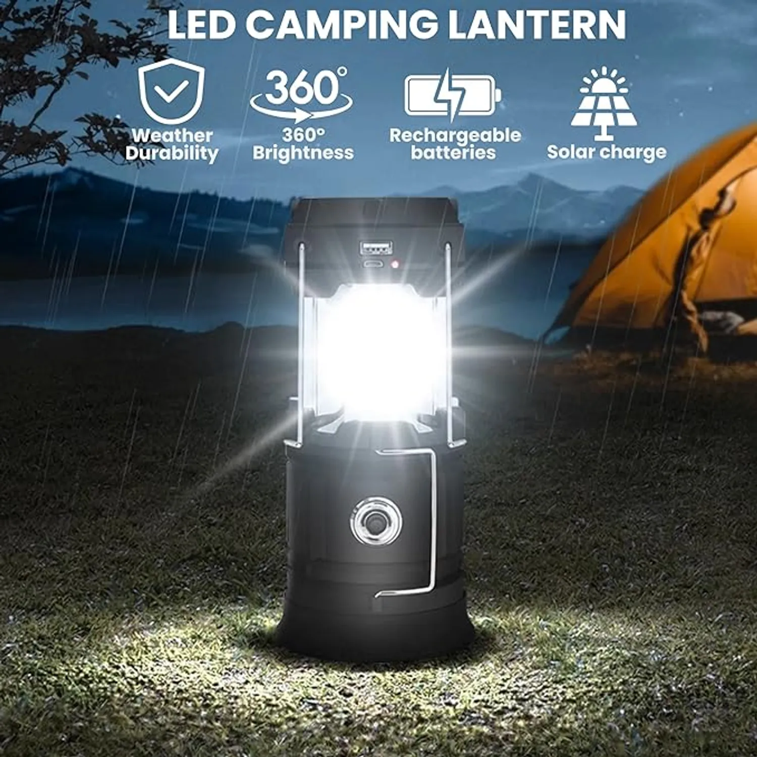 Lampara LED solar y batería recargable, plegable y con salida usb. Ideal para camping, hogar, actividades al aire libre. Dispone de linterna en la parte inferior. Súper ligera, plegable y muy práctica. Apta para usar al aire libre, pesca, camping, hogar, aventura.