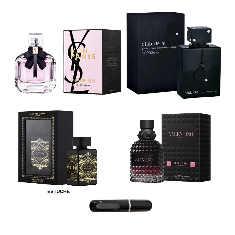 4 PERFUMES MON PARIS, LATTAFA OUD FOR GLORY, CLUB THE NUIT, VALENTINO BORN IN ROMA MAS 1 PERFUMERO RECARGABLE
