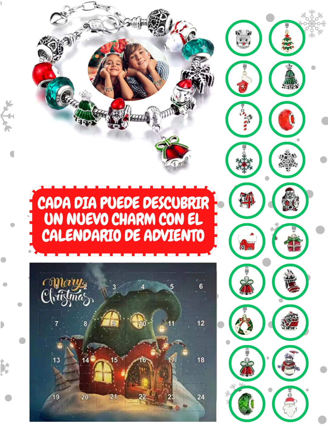 Cada pulsera está elaborada en tono plateado e incluye divertidos dijes esmaltados con motivos clásicos de Navidad: Papá Noel, renos, árbol de Navidad, copos de nieve, regalos, campanas, guantes y bastones de caramelo.