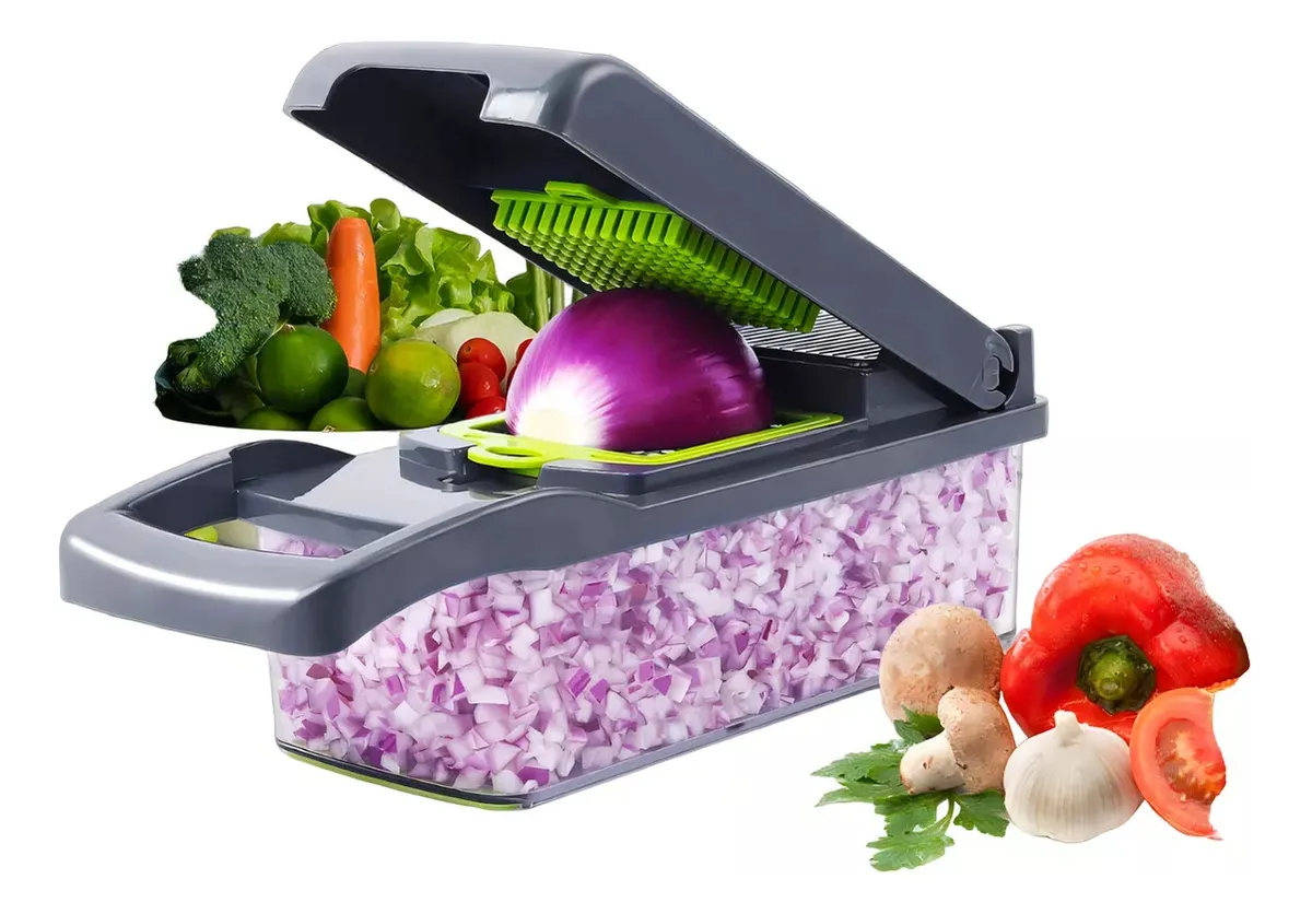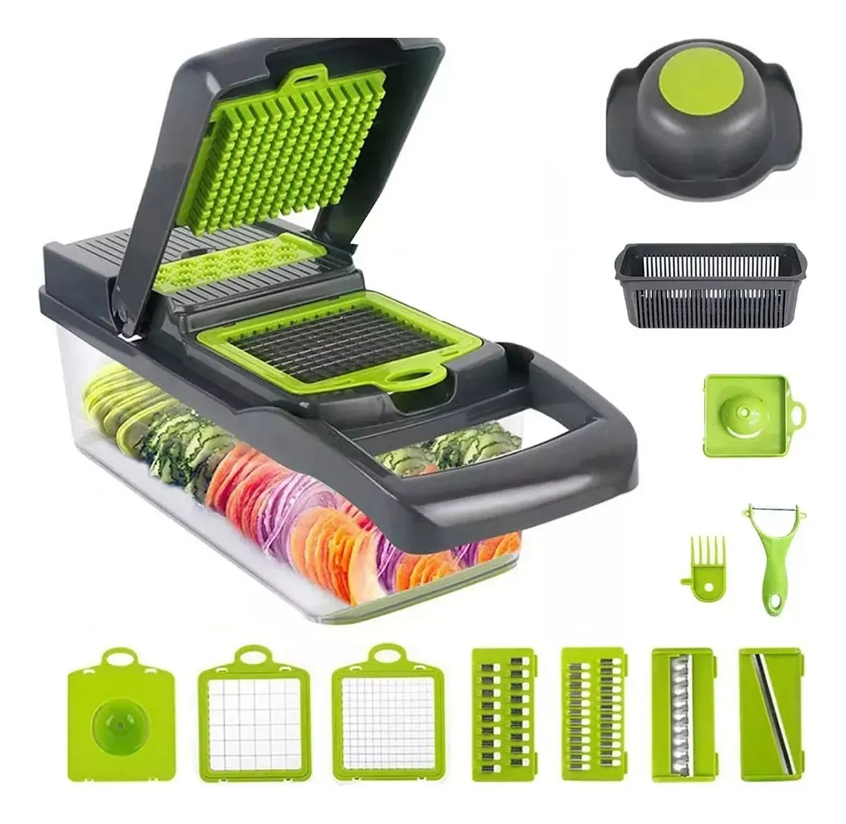 Este set incluye 16 piezas versátiles, entre ellas rebanadoras, ralladores y cortadores para diferentes tipos de preparación. Su material resistente garantiza durabilidad, mientras que su diseño compacto facilita el almacenamiento. Ideal para quienes buscan practicidad y eficiencia en la cocina, permitiendo crear platos con presentaciones impecables y sin esfuerzo.