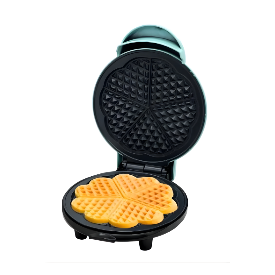 El diseño circular y compacto permite un manejo sencillo y un almacenamiento práctico cuando no se encuentra en uso. El sistema de cierre mantiene la mezcla distribuida entre ambas placas, dando como resultado waffles con forma definida según el patrón del molde.